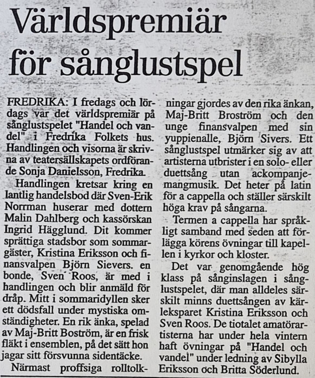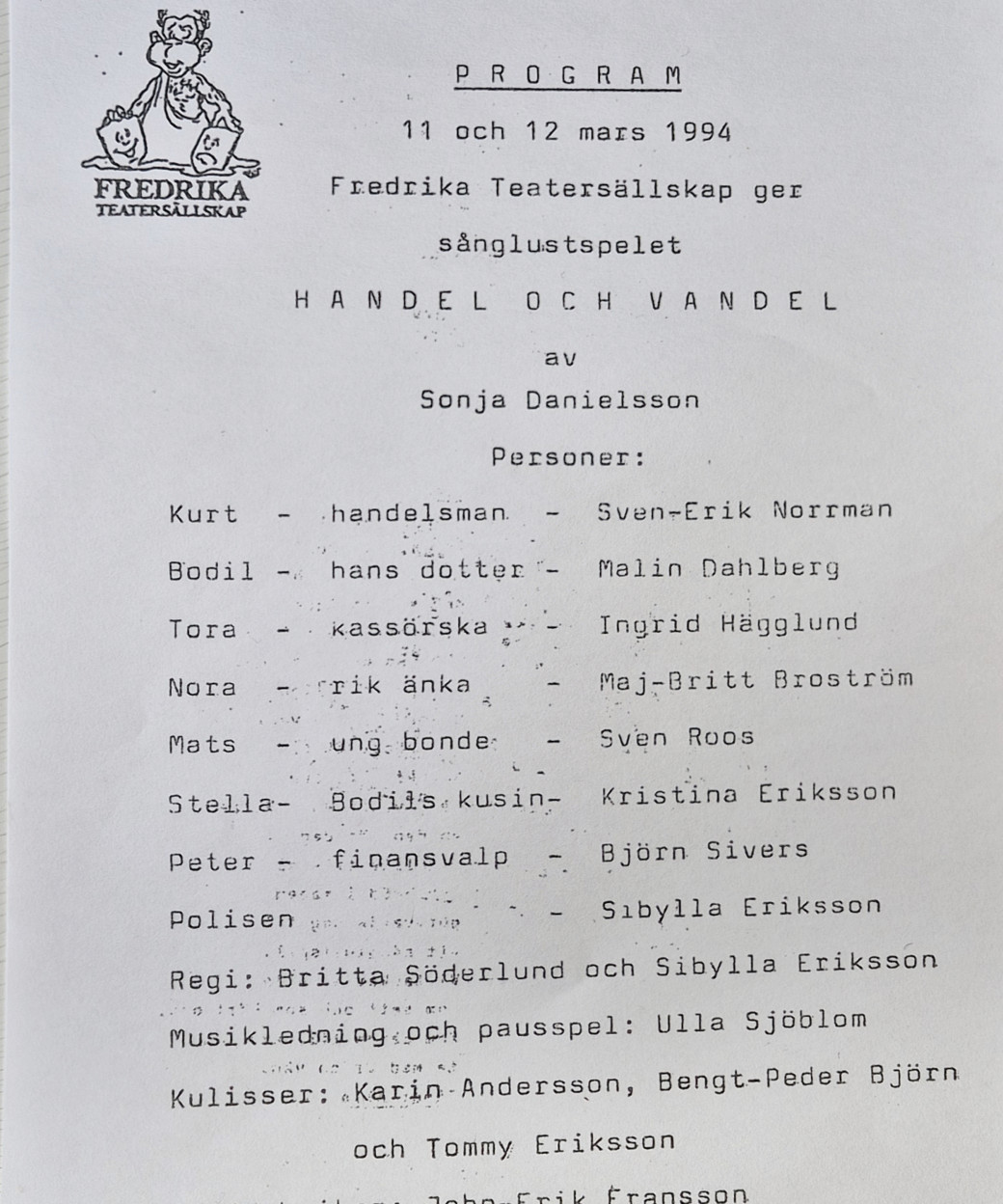 Uppförd i Fredrika Folkets Hus i mars 1994 av Fredrika Teatersällskap