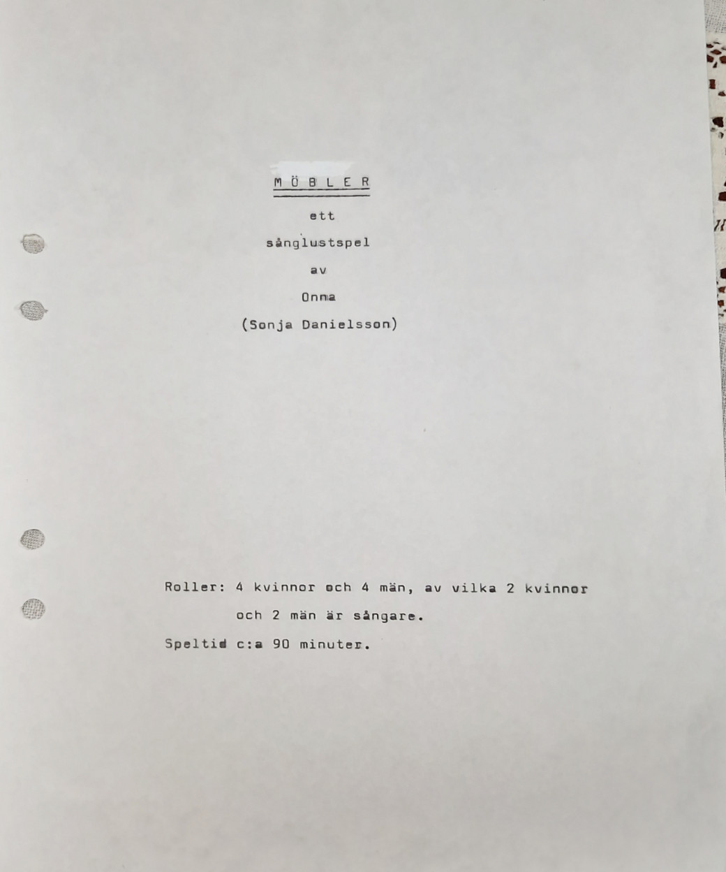 Sångspelet “Möbler” skrivet 1992 och uppfört av Fredrika Teatersällskap i Fredrika Folkets Hus i februari 1995 inskannat från Sonja Danielssons maskinskrivna och delvis handskrivna original.