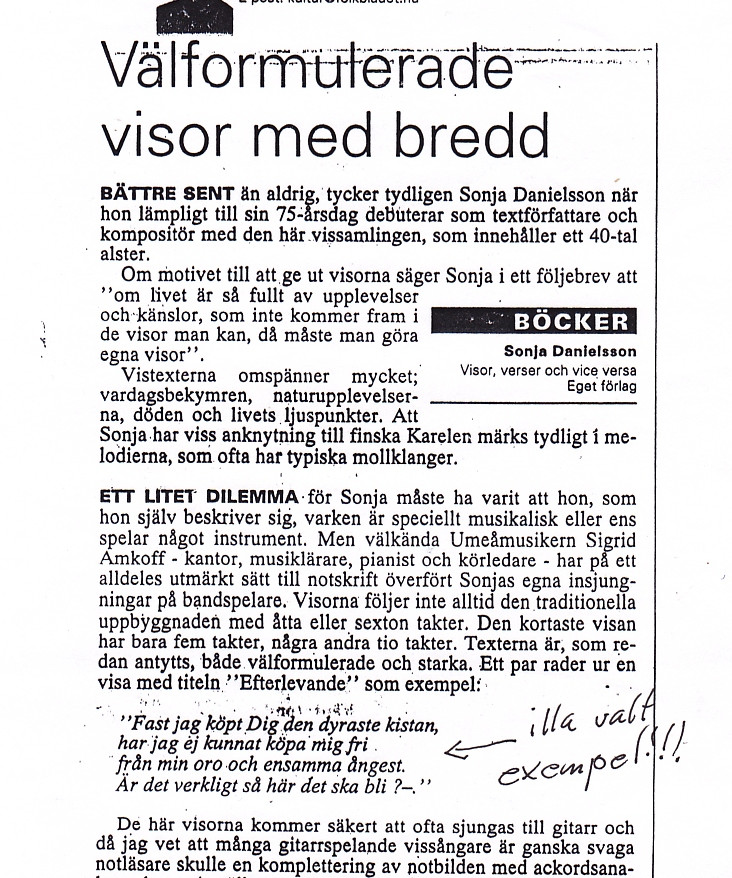 Denna visbok var Sonjas första visbok. Den kom ut 2001 när Sonja var 74 år.